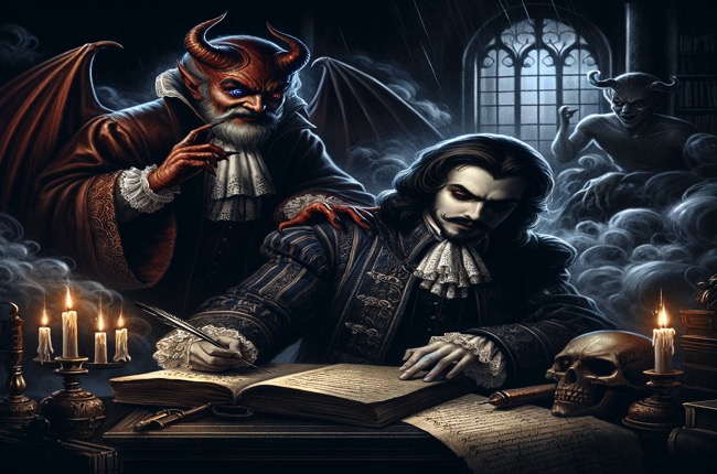 In Act 2 of “Doctor Faustus,” Faustus thinks more about his decision to use magic and work with demons. Mephistophilis comes back to him with a message from Lucifer. Lucifer agrees to give Faustus magical powers and Mephistophilis’s service for 24 years, but in return, Faustus must give his soul to Lucifer after the 24 years are over. Faustus agrees to this deal. He signs a contract with his own blood to make it official.
