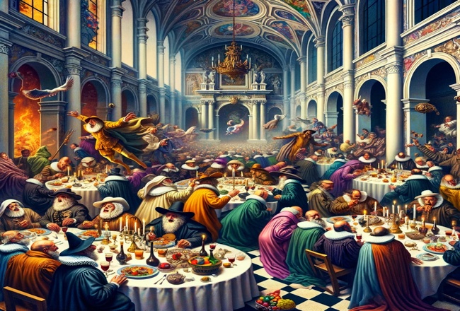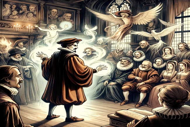 But not everything is fun for Faustus. He starts to feel sad about the deal he made with Lucifer. He thinks about God and wonders if he can still be saved. Some old friends visit him, and they talk about God and heaven. Faustus feels confused and scared about his future.