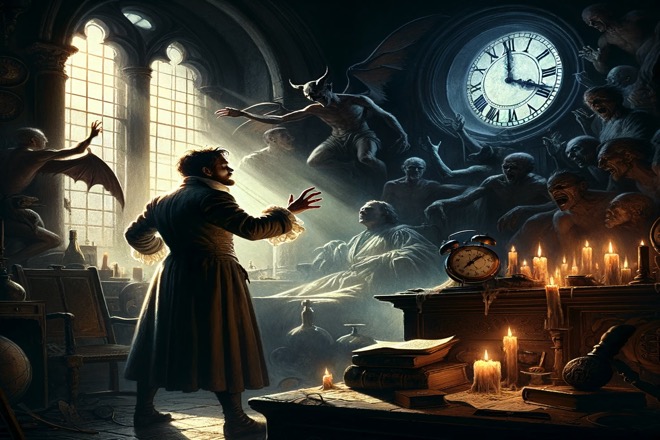 As his last day goes by, Faustus becomes more and more afraid. He wishes he could ask God for forgiveness and save his soul, but he thinks it’s too late for him. He feels very alone and knows that soon the demons will come to take him.