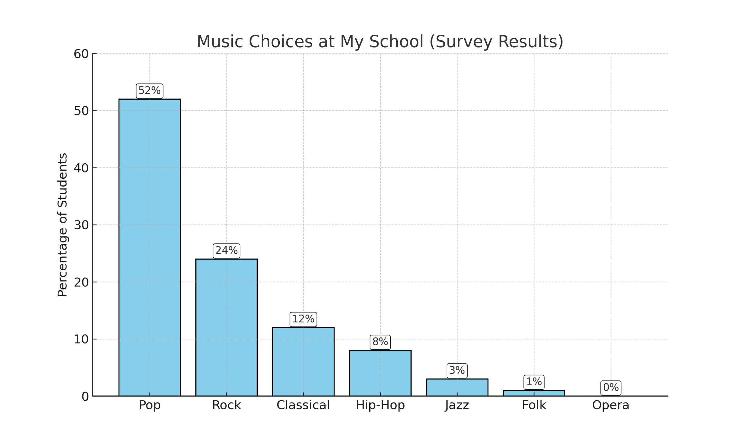 More than half of the students seem to have chosen Pop music, which means the majority of the students enjoy this genre. - Rock music (24%)