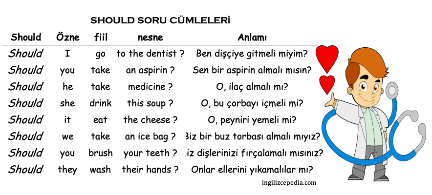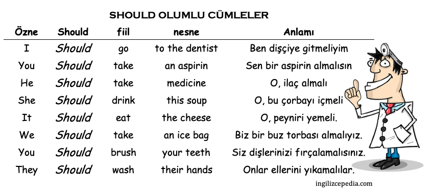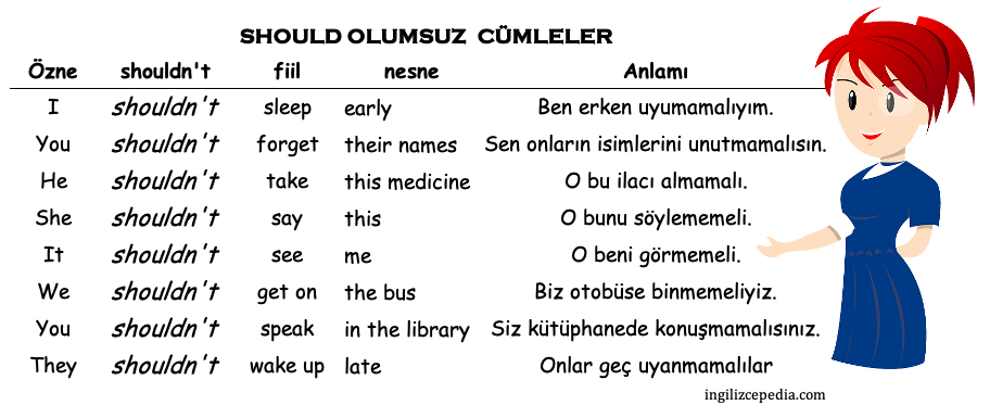 Should yardımcı fiili, cümle içerisinde “can” ile aynı biçimde kullanılır. Özne ile fiil arasında kullanılan “should” sonuna “not getirilerek olumsuz yapılır. Cümlenin başına getirilerek de soru cümlesi kurulur. Tablolarımızı inceleyip daha sonra pratik yapalım.